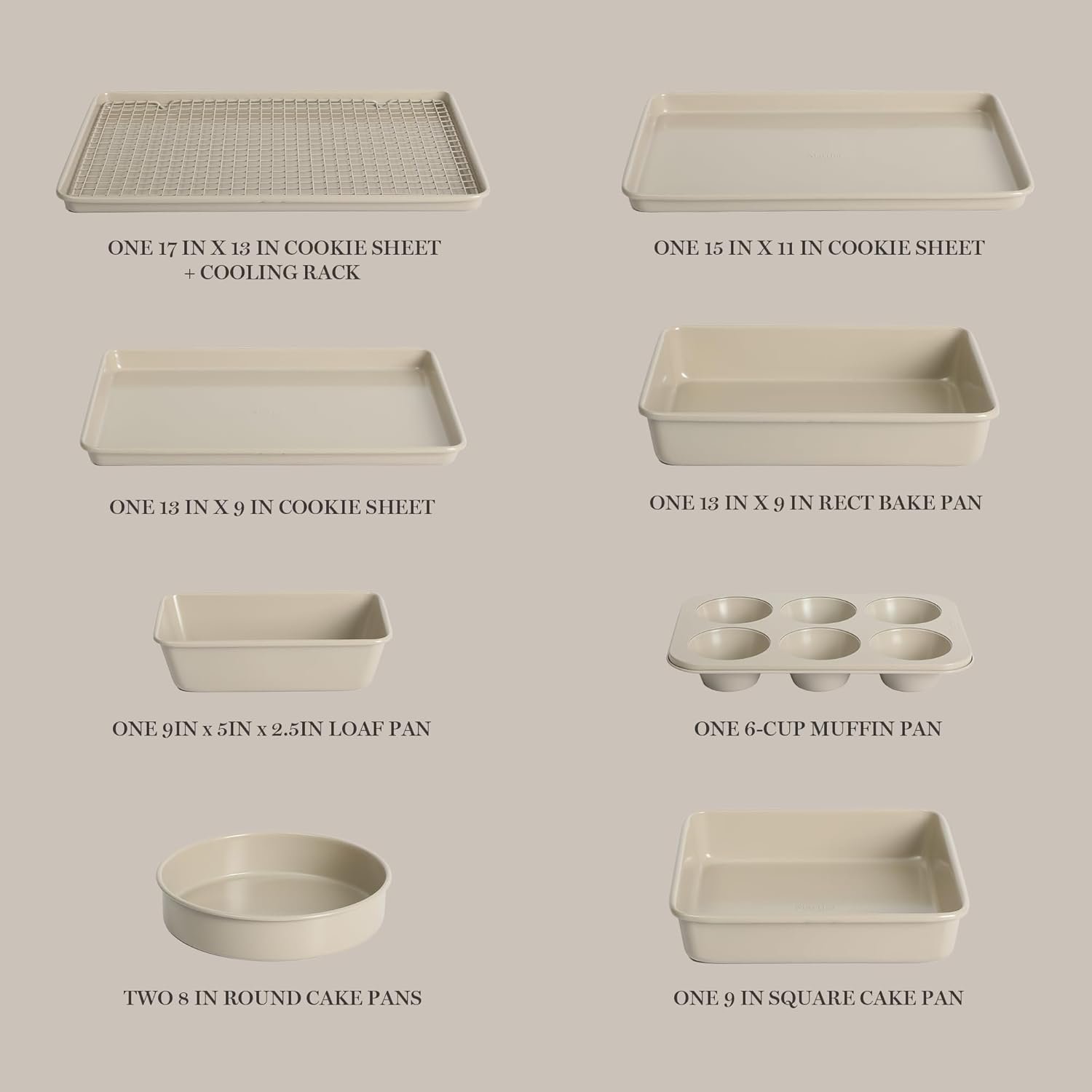 • Set Includes: 10 pieces including cookie sheets, loaf pan, muffin pan, and cake pans