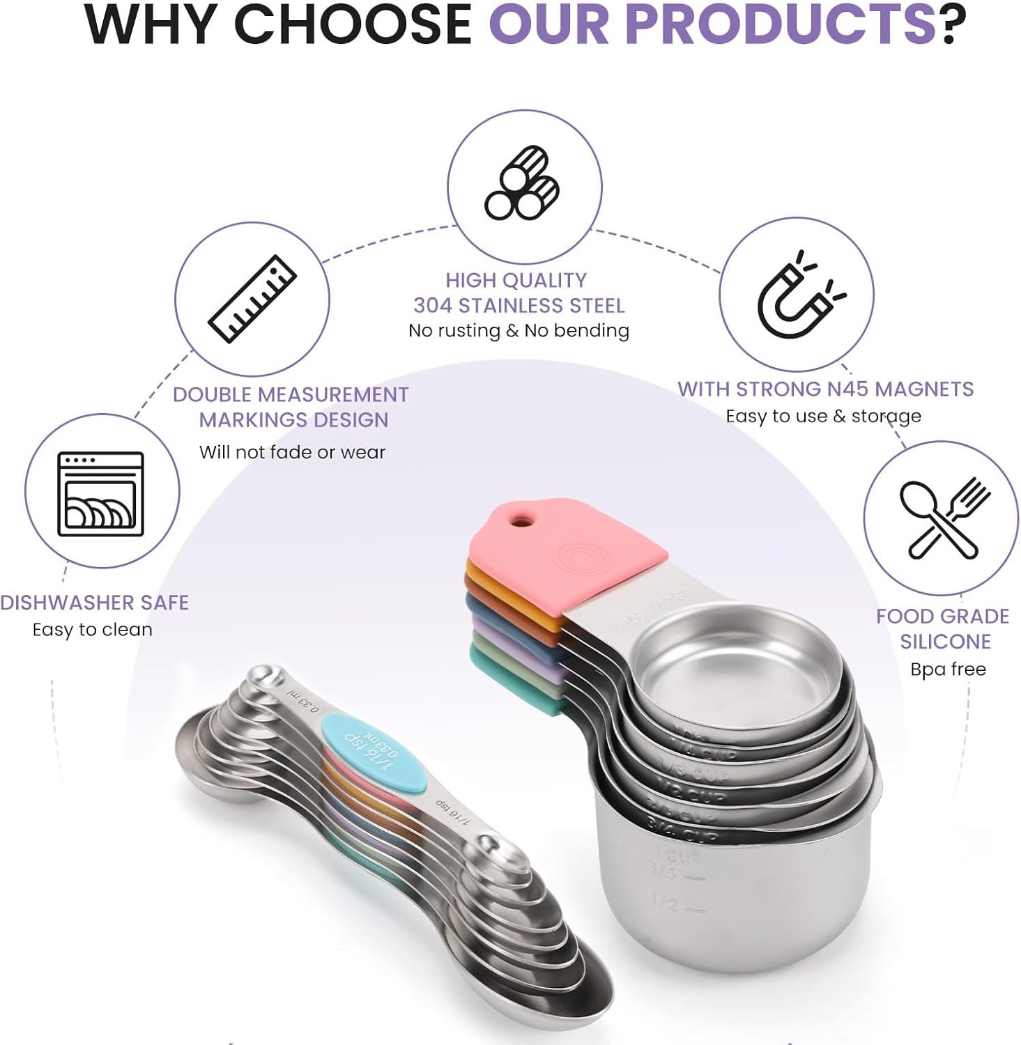 One of the standout features of this Measuring cups and spoons set is its magnetic nesting design. All pieces conveniently snap together for compact, organized storage, saving valuable kitchen space. The magnets also prevent pieces from getting lost, making it easier to keep your kitchen tidy and functional.